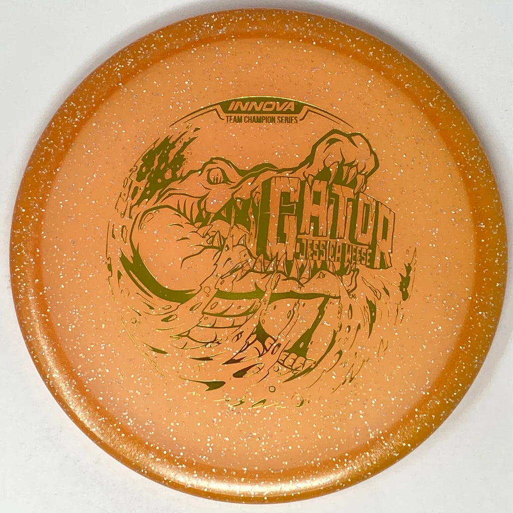 Metal Flake Champion Gator – The Gator is the go-to Overstable Midrange for the Innova lineup. The Gator has a very unique and blunt nose that really creates a slow stable disc that has a ton of control. Great for both forehands and backhands this disc is a great utility disc for anyone that loves Innova and needs an overstable approach disc. This is a small diameter midrange and really has a great feel. A staple in the bags of the top pros, it is a very reliable flight. The flatter ones tend to be more overstable and have a great feel forehand. The Gator will fight headwinds and find skips where other discs fail! Used by many pros over the years it is really a disc that is trusted by many players. Available in a ton of plastics, you will find one that you like. This is a disc that both power arms and more intermediate arms can throw for utility upshots and anything needed to fight the wind. The Gator is a great disc and Innova fans will love it!
